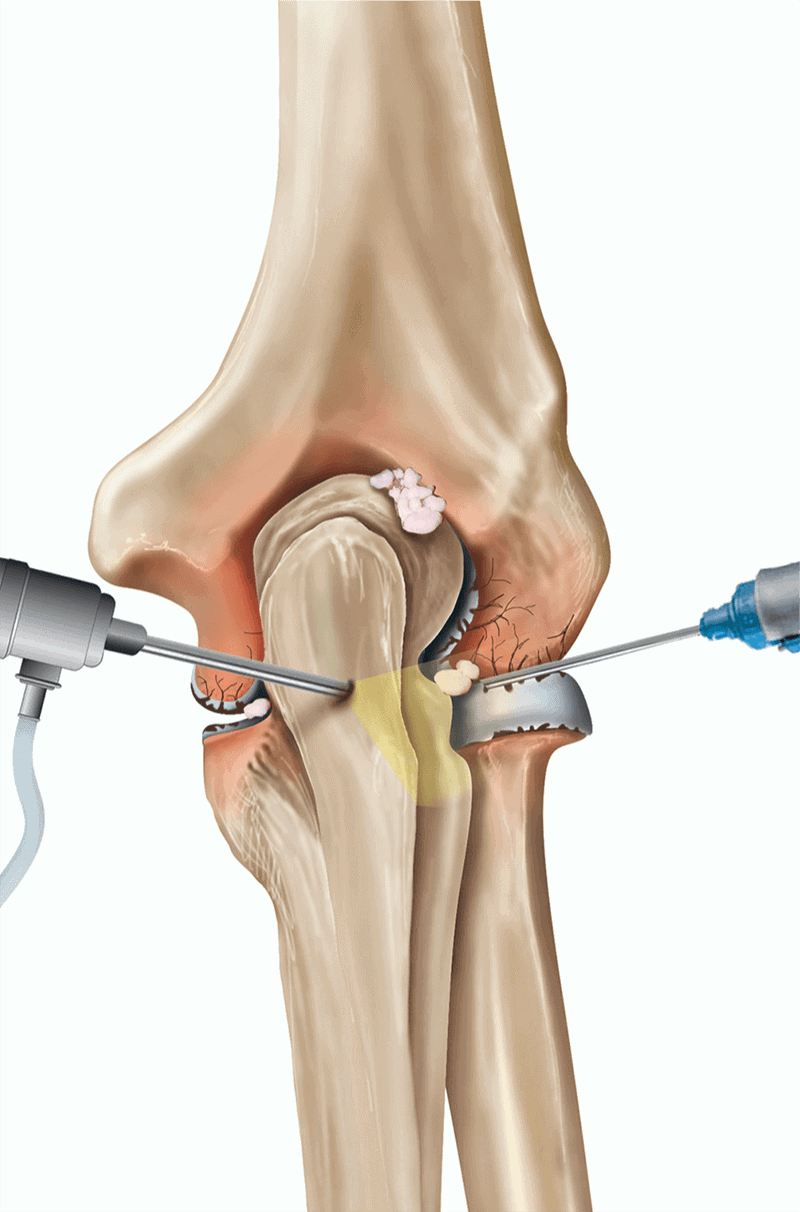 Elbow arthroscopy is performed using an arthroscope—a pencil-thin instrument with a camera and light—inserted into the joint. This allows the surgeon to see the inside of the elbow and guide small surgical tools through additional tiny incisions to perform repairs.
